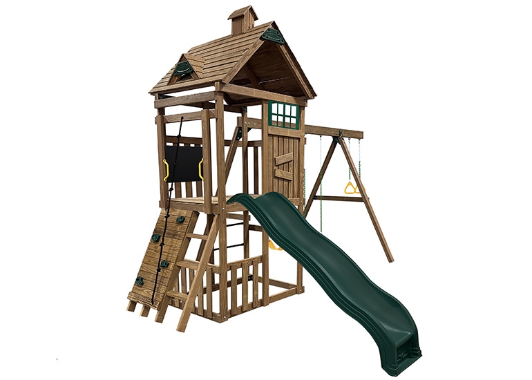 The Denali Freedom Fort includes Everything as Shown.  Wood for playdeck, clubhouse, roof, beam & lower fence, brackets, hardware, slide, swing seats, gym rings, play handles, climbing bars, magnetic chalkboard and combo rock wall with ladder, rocks & rope.   You can easily add on to this playset with PlayStar's innovative Components.