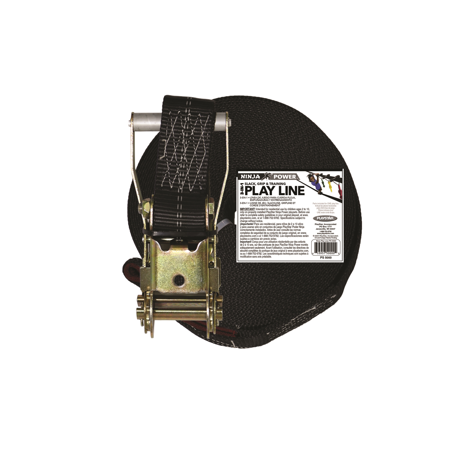 Special High tension Play line. Easily add PlayStar's Ninja Power Grips. Use alone as Slack Line, Hang overhead as training line. Combine with Ninja Tower and Platform. 60 ft. total length. Features waterproof sleeve to cover large ratchet.
